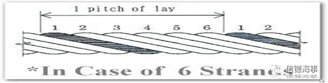 一個捻距是指繩股繞繩芯螺旋一周時所移動的距離,也就是沿著繩芯長度方向上,繩股數(shù)所占有的距離,參考下圖(以6股鋼絲繩為例)